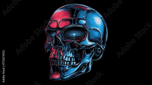 skull, chrome, metal, shiny, futuristic, neon, skeleton, technology, science, fiction, robotic, anatomy, head, artificial, intelligence, 80s, 90s, mechanical, illustration, modern, digital, detailed, silver, blue, red, three-dimensional, design, object, concept, artistic, bionic, cyber, element, hardware, abstract, background, horror, technical, realistic, creative, steel, light, structure, high technology, black, side, contour
