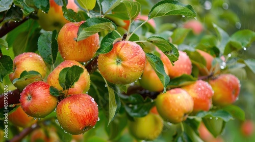 Shiny delicious apples hanging from a tree branch in an apple orchard