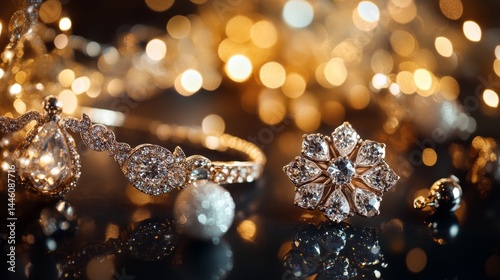 Shiny earrings, a necklace, and sparkly crystals are shown against a dark background. Christmas decorations and twinkling lights create a soft, blurry effect.