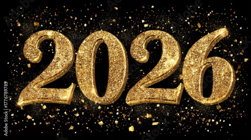 Shiny Golden 2026 Number with Sparkling Confetti on a Black Background for Celebratory Themes and New Year Events