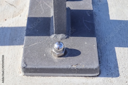 Shiny metal bolt securing railing to concrete surface