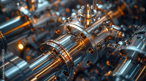 Shiny metallic steel components, showcasing precision engineering and exactness, intricate details of the alloy reflecting light brilliantly