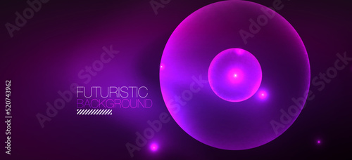 Shiny neon geometric abstract background. Glowing lights on round shapes, triangles and circles. Wallpaper for concept of AI technology, blockchain, communication, 5G, science, business