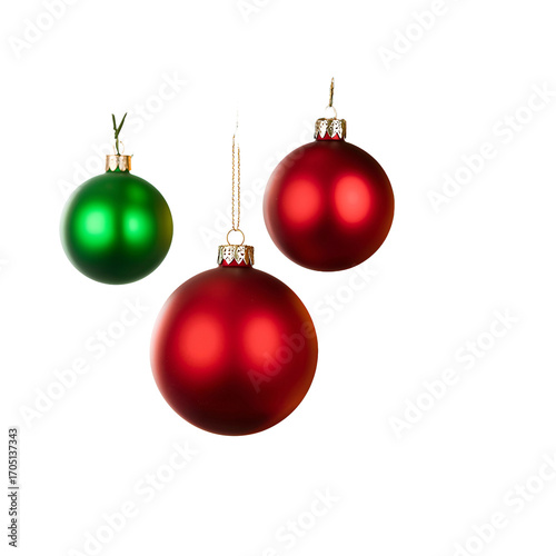 Shiny red & green glass Christmas balls hanging from a tree for holiday celebration