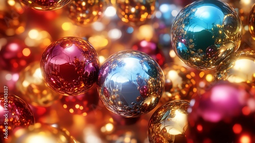 Shiny reflective baubles in red, gold, blue, and green, with warm bokeh lights in the background.
