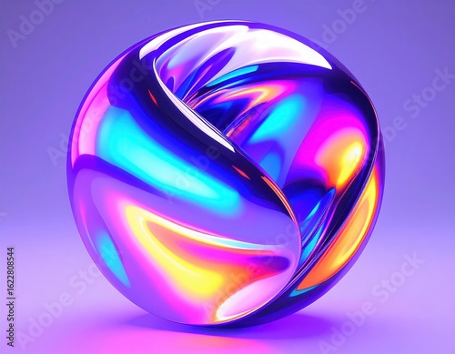 Shiny, reflective, twisted spherical object with metallic, iridescent hues. The surface displays vibrant gradients of blue, purple, pink, and orange, creating a swirling pattern.