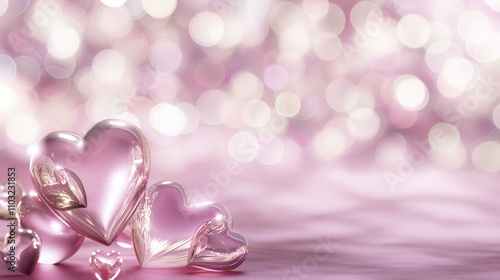 Shiny soft purple hearts on abstract bokeh background creating romantic and festive atmosphere. Happy holiday greeting concept.