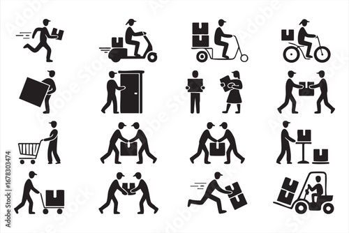 delivery, logistic, courier, shipping, package, parcel, transport, scooter, bicycle, forklift, men at work, service, distribution, e-business, fast, express, order, good, moving, storage, warehouse, supply, retail, online, business, client, shopping, box, trade, send, receive, freight, doodle, vector, illustration, design, graphic, set, collection, black, white