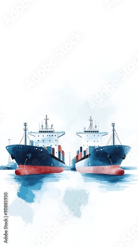 Shipping industry, cargo ships in port, global trade, Watercolor style
