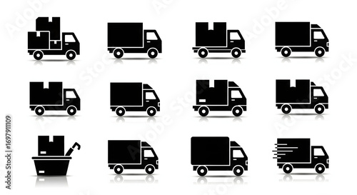 Shipping Truck Icon Set: A streamlined collection of simple, silhouette icons of cargo trucks, each one depicting various stages and positions, suggesting efficiency and reliable transport.