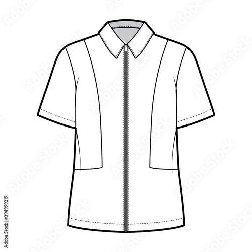 Shirt full zip-up technical fashion illustration with short sleeves, relax fit, yokes, flat collar. Template front, white color. Women men unisex top CAD mockup