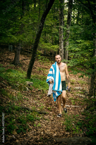 man, walking, carrying, towel, clothes, forest, shirtless, lifestyle, swimwear, nature, holding, calmness, tree, looking away, environment, vacation, happiness, clothing, enjoyment, avocation, front view, full-length, day, outdoors, one person, male