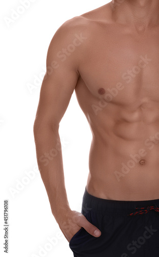 Shirtless man with slim body isolated on white, closeup