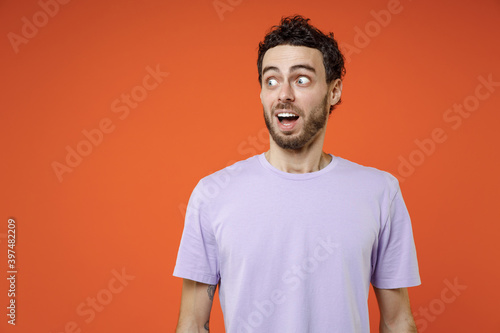 Shocked amazed surprised excited young bearded man 20s wearing basic casual violet t-shirt standing keeping mouth open looking aside isolated on bright orange color wall background studio portrait.