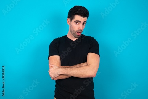 Shocked embarrassed Young man wearing black T-shirt over blue studio background keeps mouth widely opened. Hears unbelievable novelty stares in stupor