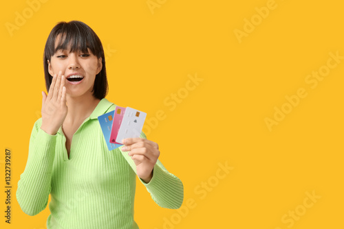 Shocked young woman with credit cards on yellow background