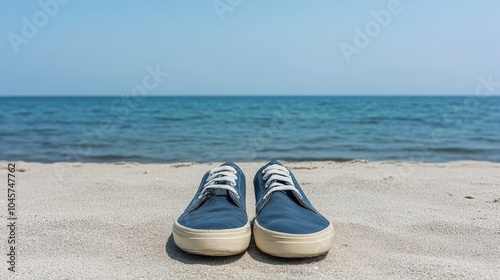 shoe, beach, sea, sand, footwear, summer, relaxation, travel, nature, coastline, vacation, horizon, leisure, calm, vacationing, solitude, calmness, distance, sun, blue, coastal, landscape, minimalism, personal, abandoned, scenic, environment, beachwear, simple, pair, canvas, walking, sunny, day, view, open space, lifestyle, seascape, bright, natural, serenity, atmosphere