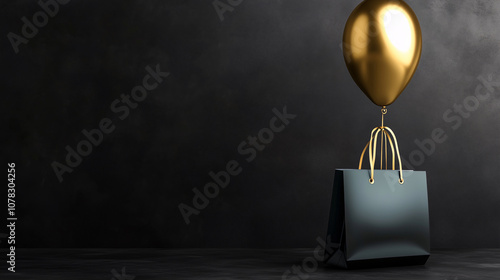shopping bag with golden balloons, black friday style, shopping and new year concepts