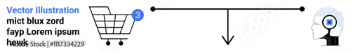 Shopping cart with blue tag, horizontal line with downward arrow, human head with gear symbol, indicating connection. Ideal for e-commerce, marketing, decision-making, technology, innovation