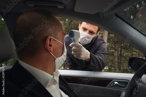 inspection, temperature, car, fever, corona, virus, surgical, protection, prevention, sterile, hygiene, outbreak, pandemic, global, male, men at work, essential, social, isolation, medicals, sick, spreading, turkey, turkish, senior, adult, mask, facial, cover, symptom, healthy, ill, body, test, contagion, police, security, expression, face, normal, standard, man, anxiety, safety, safe, quarantine