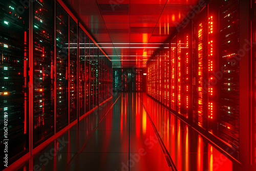 Shot of Data Center With Multiple Rows of Fully Operational Server Racks. Neural network ai generated art