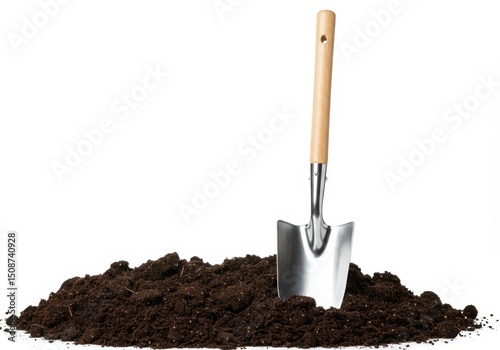 Shovel standing in a pile of dark soil against white background