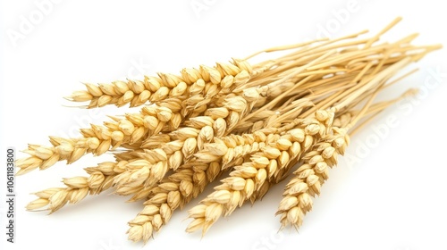 Show a realistic image of golden wheat stalks against a pure white background, emphasizing the intricate details and natural beauty of each grain and kernel.