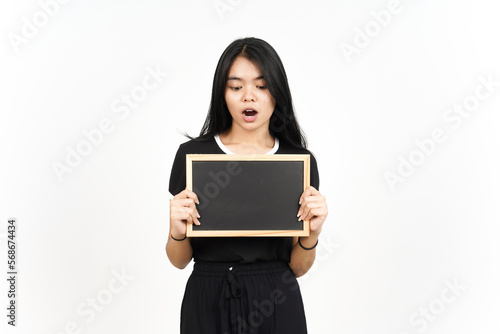 Showing, Presenting and holding Blank Blackboard with Shocked Face Of Beautiful Asian Woman