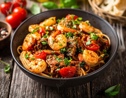 pasta, shrimp, tomatoes, sauce, seafood, italian, dish, food, bowl, delicious, healthy, dinner, meal, cooking, cookery, receipe, fresh, organic, spicey, hearty, flavorful, mediterranean, eatery, lunch, plate