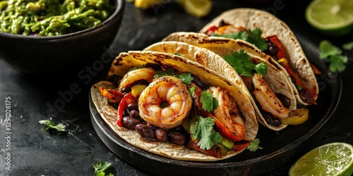 Shrimp Fajitas with Black Beans and Guacamole on a dark background