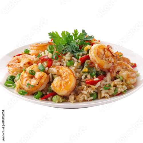 rice, shrimp, asian cuisine, stir fry, colourful, vegetable, green onion, parsley, seafood, dish, plate, white plate, cooked, spicey, mixed, prawn, fried, white background, topview, garnish, delicious, fast food, home cooked