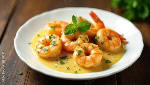 Shrimp in a rich and creamy garlic butter sauce, butter, plate