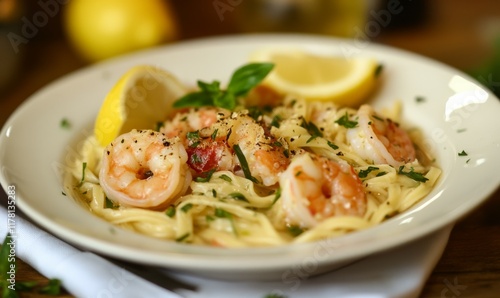 Shrimp noodle soup with lemon and fresh herbs