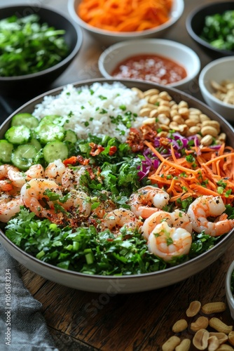 bowl, shrimp, rice, cucumber, cashew, salad, greener, red, orange, white, brown, green, food, fresh, healthy, delicious, meal, lunch, dinner, snack, asian, vegetable, cilantro, carrot, purple, wooden, table, pepper, dish, sauce