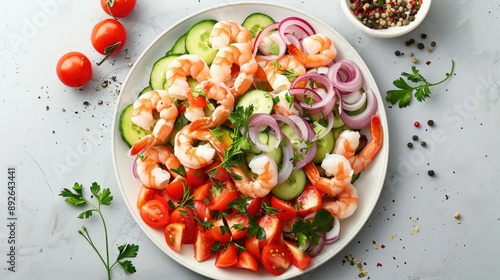 Shrimp salad displayed on a white stone background, top view, with fresh seafood and a colorful mix of ingredients