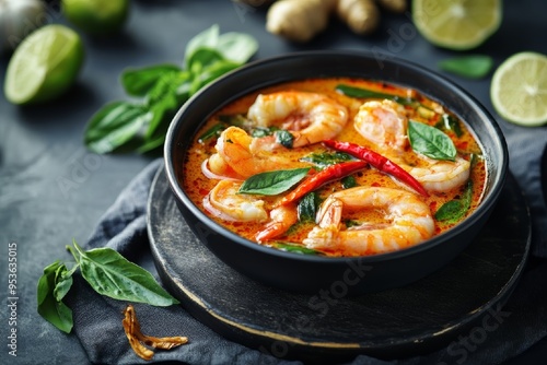 soup, shrimp, basil, chili, pepper, thai, food, culinary, cookery, spicey, favor, coconut, milk, lemongrass, ginger, lime, citrous, red, green, bowl, wooden, board, fresh, delicious, appetising, gastronomy, dinner, lunch, flavorful, aromatic, healthy, diet, eat, epicure, asian, seafood