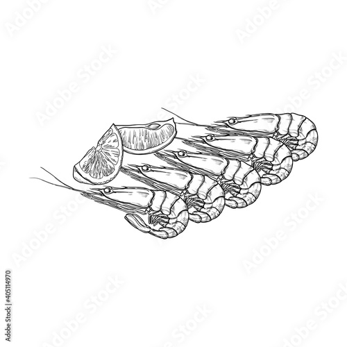 Shrimp with lime isolated on a white background. Hand drawn vector illustration.