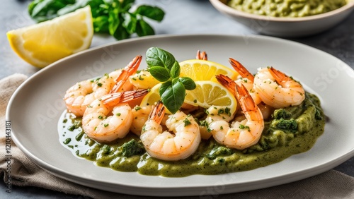 shrimp, pesto, sauce, lemon, white, plate, garnished, half, fresh, basil, sprig, food, culinary, receipe, seafood, epicure, healthy, vibrant, colours, appetising, presentation, natural, ingredient, herb, texture, contrast, lighting, closeup, detail, delicious, mediterranean, favor, creativity, arrangement, composition, aesthetic, warm, tone, soft, sharpened, indoor, inspiration, photo, styling, harmony, freshness, indulgence