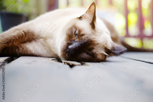Siamese cat relax on wood floor with sunlight in natural of garden
