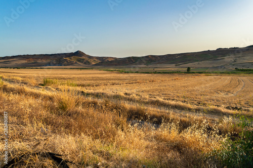 vale, sun, sunset, sundown, sunlight, light, sunshine, landscape, sicilia, italy, europa, nature, background, beauty, grass, field, hill, panorama, view, scenery, summer, colours, yellow, gold, colourful, vacation, travel, trip, journey, sky, blue, harvest, wheat, wheatfield, hay, agriculture, green