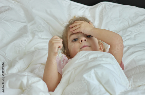 Sick little girl in bed with a thermometer under her arm.