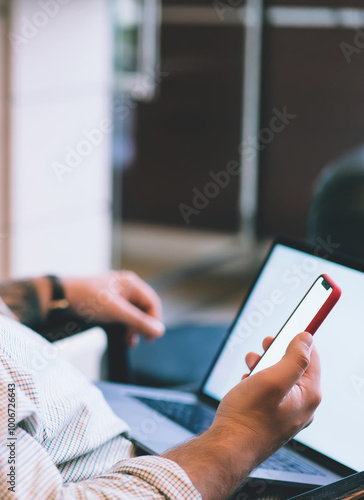 Side cropped of caucasian young man holding blank display mobile phone in hands, verification of banking data, shopping online on laptop computer and cellphone with mock up screen for web advertising