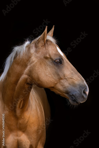 palomino, quarter horse, chestnut, brown, head, equine, horse, purebred, beautiful, gelding, equestrian, isolated, black background, portrait, studio, fine art, posing, western, no people, looking, attentive, head shot, cutting, majestic, elegant, gold, closeup, agriculture