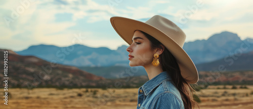 Side profile of a woman wearing a wide-brimmed hat and a denim shirt with gold earrings, in front of a mountain range, generative AI