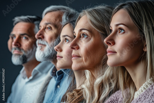 Side profile of diverse multi-generational family looking forward. Group of people are standing together and looking towards future with hope. Concept of family bonds, unity and passage of time