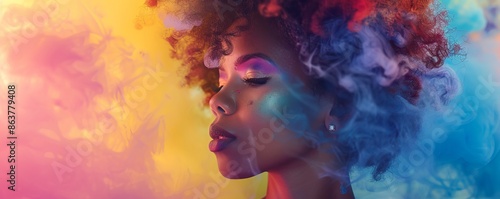Side view of a African American woman with vibrant, colorful smoke-like hair, creating an artistic and surreal visual effect.