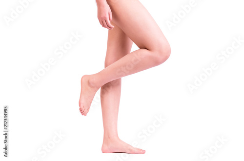 Side view of a beautiful naked legs of a woman walking isolated on a white background