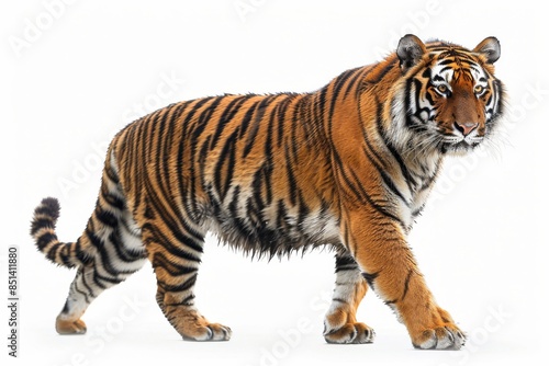 Side view of a majestic tiger walking away isolated on white background, detailed and powerful