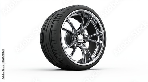 Side view of a modern car wheel with a polished finish, isolated on a white background, ideal for automotive presentations and advertising