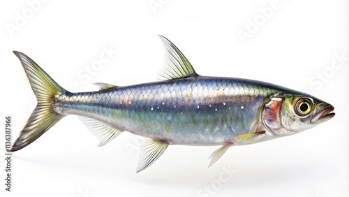 Side View of a Sardine Fish Swimming Gracefully Isolated on a White Background, Capturing the Elegance and Movement of Aquatic Life in Conceptual Photography